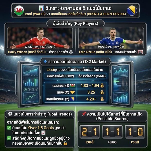 การแข่งขันฟุตบอลโลก 2026 รอบคัดเลือกโซนยุโรป คู่ระหว่าง เวลส์ พบ บอสเนียและเฮอร์เซโกวีนา ถือเป็นอีกหนึ่งเกมที่น่าสนใจสำหรับคอบอลและสายเดิมพัน เนื่องจากทั้งสองทีมมีสไตล์การเล่นที่แตกต่างกันชัดเจน เวลส์เน้นเกมรับที่มีวินัยและการสวนกลับรวดเร็ว ขณะที่บอสเนียและเฮอร์เซโกวีนาโดดเด่นเรื่องการครองบอลและการเข้าทำประตูจากแดนกลาง เกมนี้จึงมีผลต่อการลุ้นอันดับในกลุ่มอย่างมาก และเหมาะสำหรับการวิเคราะห์เพื่อต่อยอดการลงทุนในตลาดฟุตบอลโลก